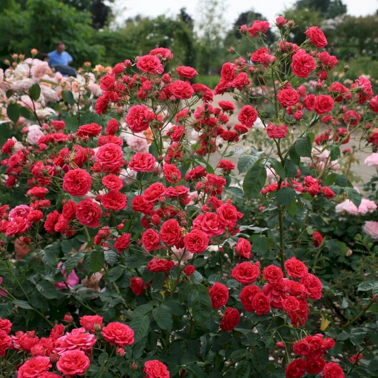 Rød til cinnoberrød. Mange halvfyldte blomster med blot en let duft. 10-20 kronblade. 8-10 cm i diameter.