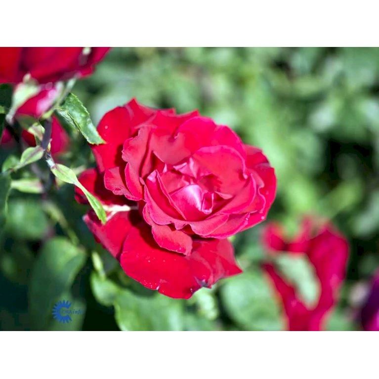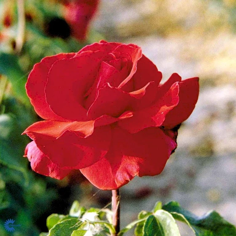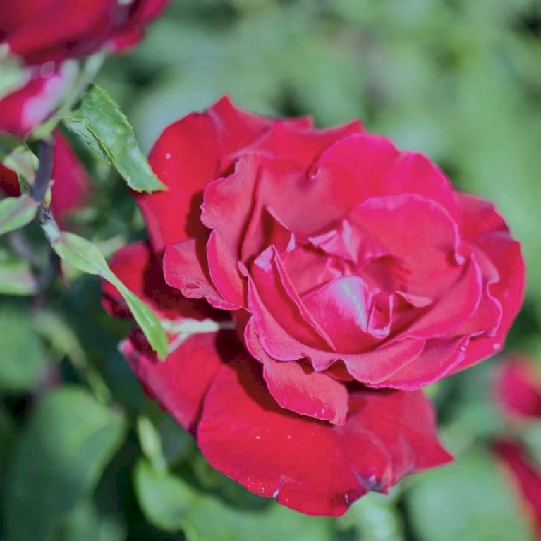 Mørkerød, stor og velformet fyldt blomst med kraftig duft. 20-40 kronblade. Op til 10-12 cm i diameter.