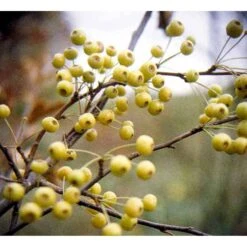 Træet har grønne blade og blomstrer i foråret med hvide blomster. Blomsterne efterfølges af utallige små gule bær-æbler i august/september