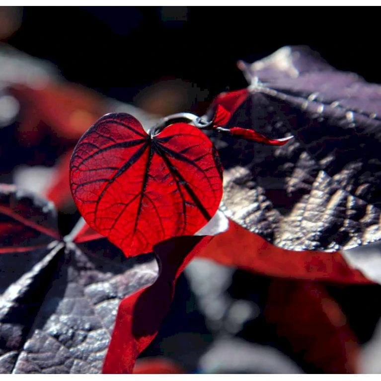 Bladene er i vækstsæsonen lysende purpurrøde. Bladene er næsten perfekt hjerteformede i udspring, senere mere runde. Gyldne høstfarver inden løvfald.