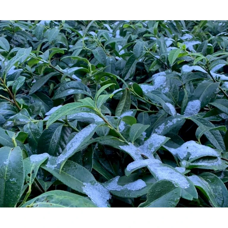 Stedsegrøn busk med slanke, blanke og mørkegrønne blade.