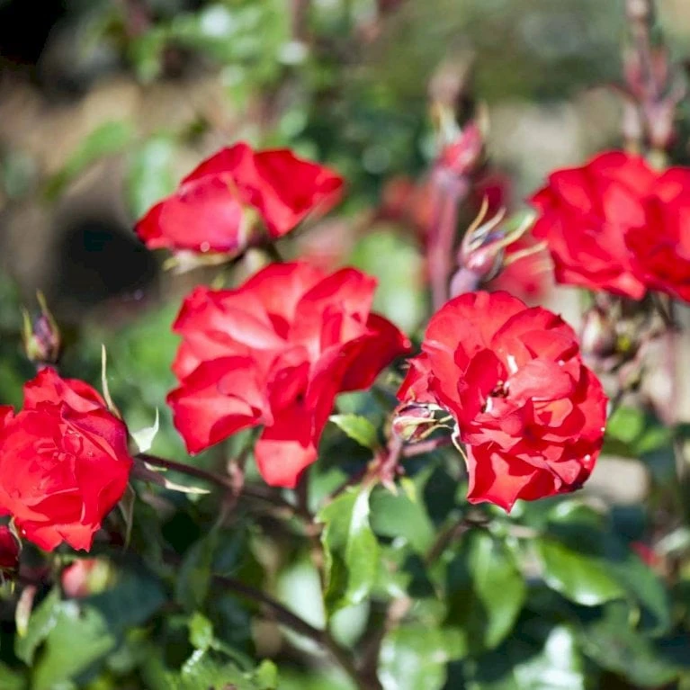 Cinnoberrøde halvfyldte blomster med kun let duft. 10-15 kronblade. 7-9 cm i diameter.