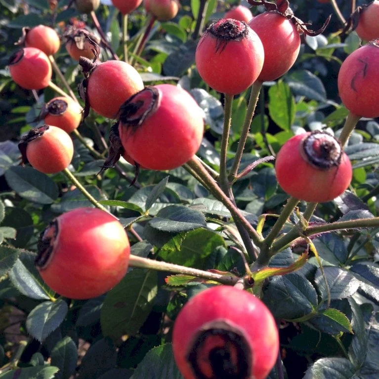 Blomstrer meget rigt fra slut juni til sent på efteråret. Sammen med årest sidste blomster ses talrige orangerøde hyben, som spises af havens småfugle i løbet af vinteren.