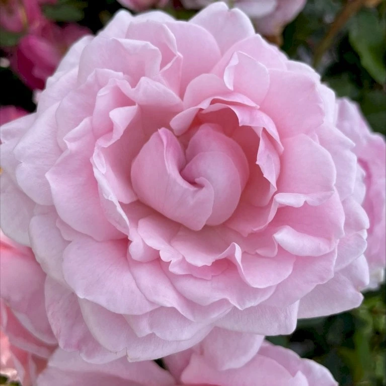 Lys rosa, ofte mørkere ind mod midten af blomsten. Velformede og godt fyldte blomster med stærk og dejlig duft. 25-40 kronblade. 10-15 cm i diameter. Blomstrer meget rigt fra slut juni til sent på efteråret.