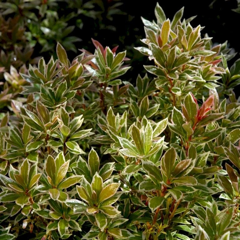 Busken har en smuk mørk til lysere rosa nyvækst, der senere bliver til tykke, hvidbroget grønne blade.