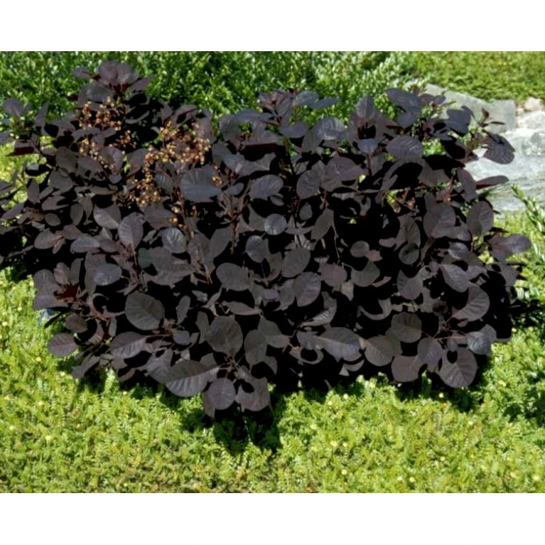 I højsommeren ses på ældre buske de iøjnefaldende lyse “parykker” af blomst, hævet over de mørke blade.