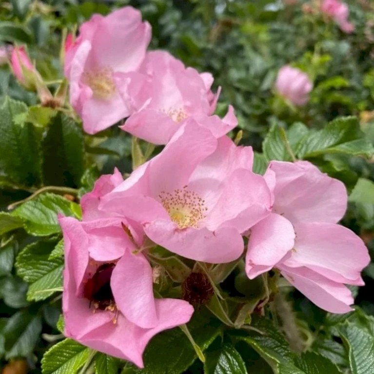 Blomstrer meget rigt fra slut juni til langt ud på efteråret. Sætter mange og store hyben.