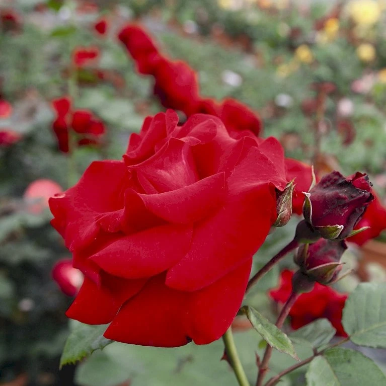 Mørkerød til blodrød. Halvfyldte blomster med dejlig, men ikke kraftig duft. 15-20 kronblade. 10-15 cm i diameter.