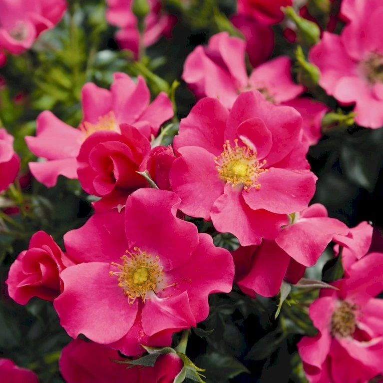 Velforgrenet, tæt og udbredt vækstform, roserne sidder typisk i klaser på mellem 6-10, til tider flere.
