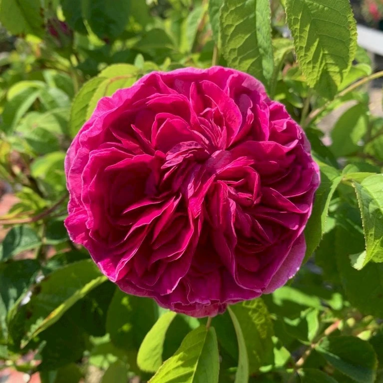 Mørk magentarød. Stor, flad og tætfyldt og undertiden nikkende blomst . Over 40 kronblade. Op til 12 cm i diameter. Middelstærk og dejlig, citrusagtig duft.