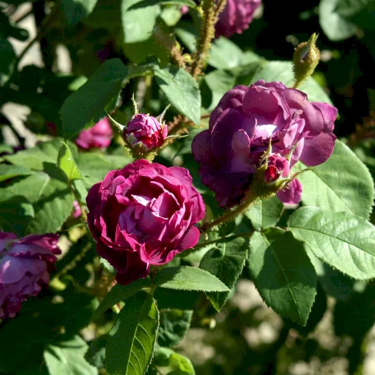 Mørkt purpurlilla, yderst særpræget og smuk farve. Kugleformede knopper åbnes til halvfyldte blomster med stærk og dejlig duft. 15-25 kronblade. 7-9 cm i diameter.